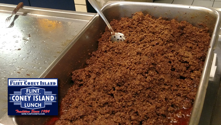 Cooking the topping slowly to a safe temperature for serving takes time, and it’s not time you really want to take when you’re just cooking up some Flint Coneys for a quick meal. As the topping comes in 4lb and 10lb tubes, Abbott’s recommends cooking it off, putting smaller amounts it in quart reclosable freezer bags, and freezing it. Then you can reheat only what you need when you need it, relatively quickly.
