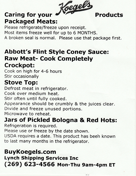 For the Die Hard Flint Coney folks like myself, compare the ingredients of this new Koegel’s product to Abbott’s similar product. Just as there are differences between the sauces of various Flint Coney restaurants, there will obviously be minor differences between Abbott’s completed sauce and this new Koegel’s version. (Note: The 25lb bag of unspiced base Abbott’s has shipped to restaurants to make their own sauce their way isn’t included here.)